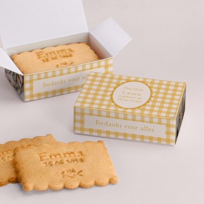 Jullie kleintje is lekker verwend...Het is tijd om iedereen te bedanken voor alle cadeautjes, kusjes en knuffels! Wat is persoonlijker en leuker dan "home made" koekjes? We hebben kleine doosjes ervoor ontworpen, afgestemd op de stijl van het bijbehorende kaartje... Een cadeau dat niet onopgemerkt zal blijven!