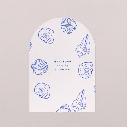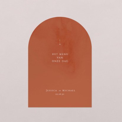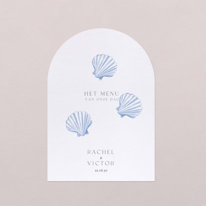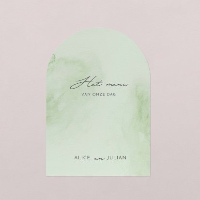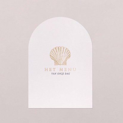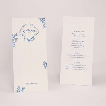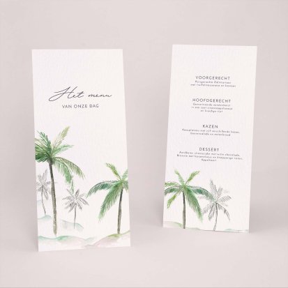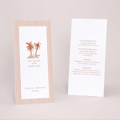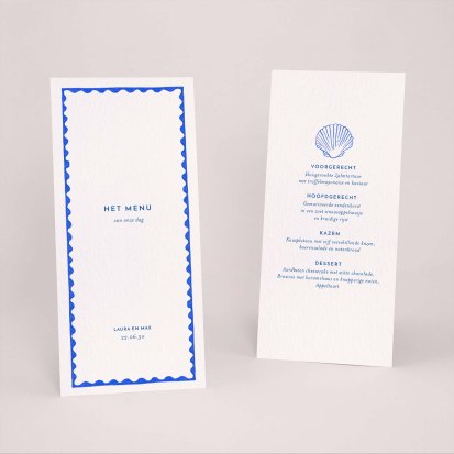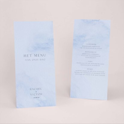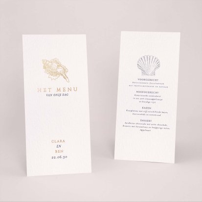 Laat je menu op onze menukaarten printen in de kleuren van jullie trouwkaart! Plaats de menukaarten op jullie tafels, zij maken de decoratie van jullie zaal af en jullie gasten vertrekken met een leuk souvenirtje aan deze prachtige avond. We raden aan om de menukaart in het midden van het bord samen met het tafelkaartje te plaatsen.