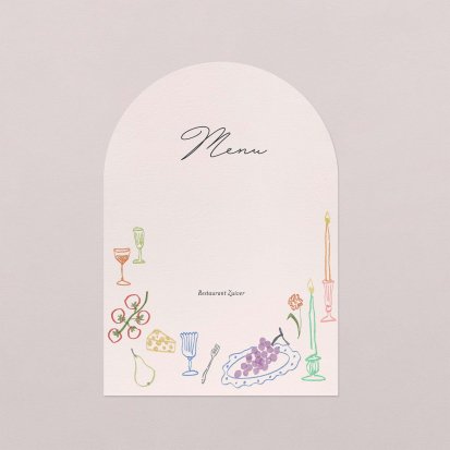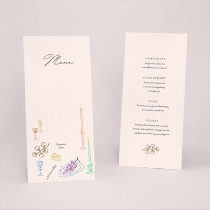 Laat je menu op onze menukaarten printen in de kleuren van jullie trouwkaart! Plaats de menukaarten op jullie tafels, zij maken de decoratie van jullie zaal af en jullie gasten vertrekken met een leuk souvenirtje aan deze prachtige avond. We raden aan om de menukaart in het midden van het bord samen met het tafelkaartje te plaatsen.