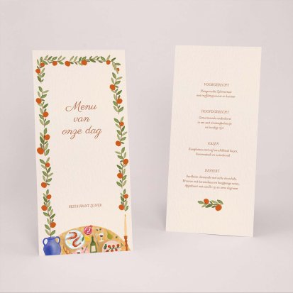 Laat je menu op onze menukaarten printen in de kleuren van jullie trouwkaart! Plaats de menukaarten op jullie tafels, zij maken de decoratie van jullie zaal af en jullie gasten vertrekken met een leuk souvenirtje aan deze prachtige avond. We raden aan om de menukaart in het midden van het bord samen met het tafelkaartje te plaatsen.