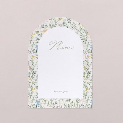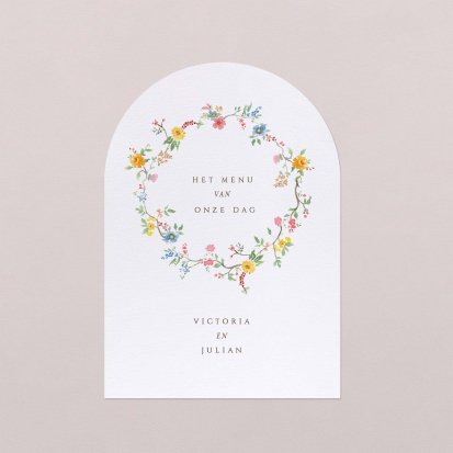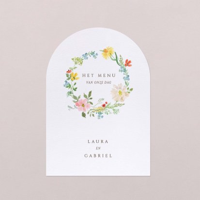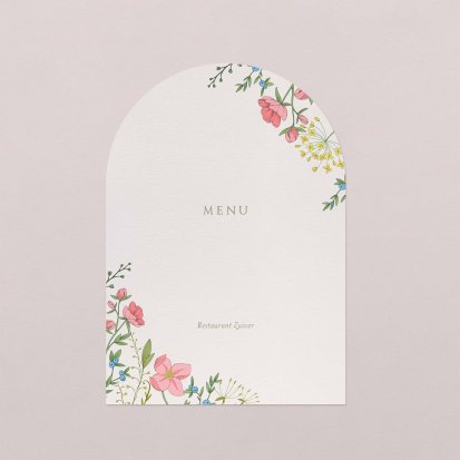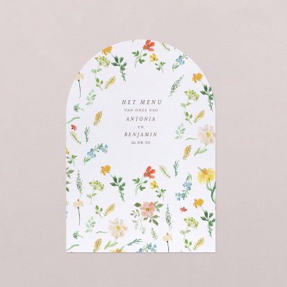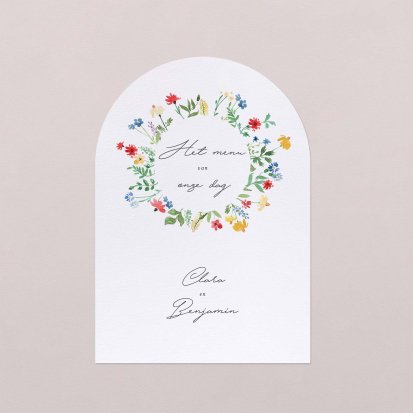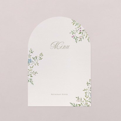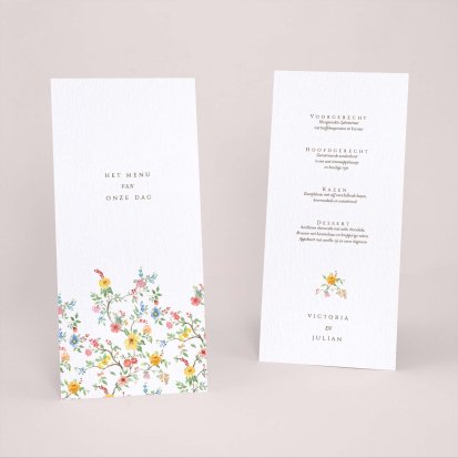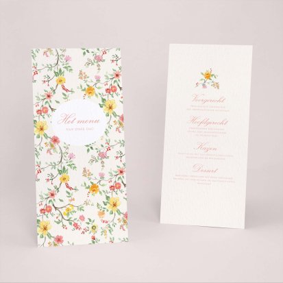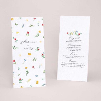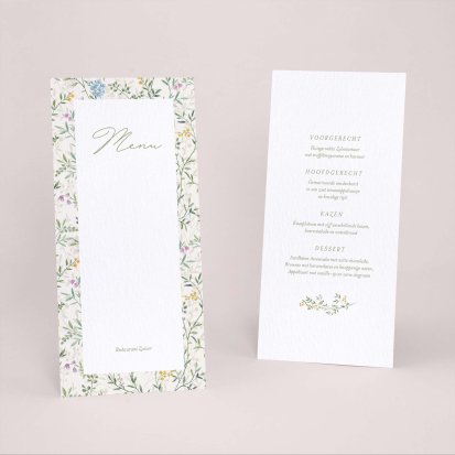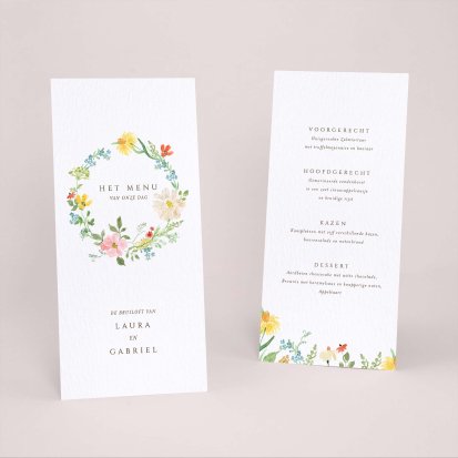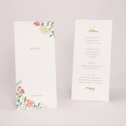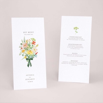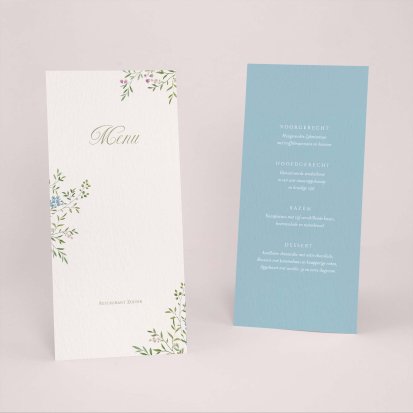 Laat je menu op onze menukaarten printen in de kleuren van jullie trouwkaart! Plaats de menukaarten op jullie tafels, zij maken de decoratie van jullie zaal af en jullie gasten vertrekken met een leuk souvenirtje aan deze prachtige avond. We raden aan om de menukaart in het midden van het bord samen met het tafelkaartje te plaatsen.