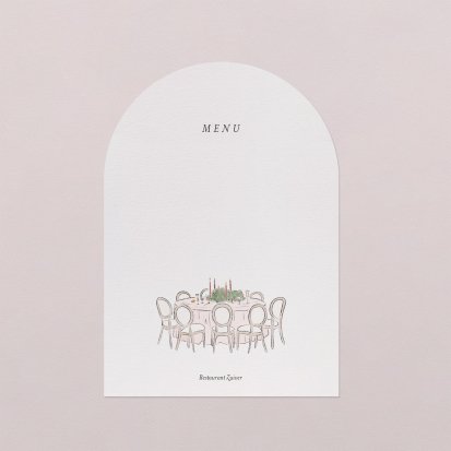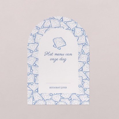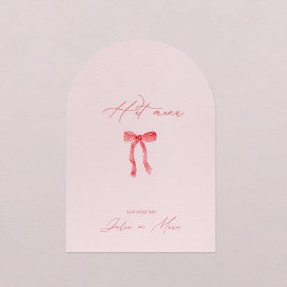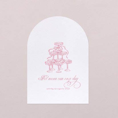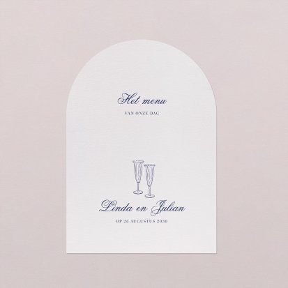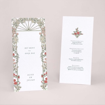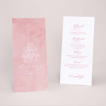 Laat je menu op onze menukaarten printen in de kleuren van jullie trouwkaart! Plaats de menukaarten op jullie tafels, zij maken de decoratie van jullie zaal af en jullie gasten vertrekken met een leuk souvenirtje aan deze prachtige avond. We raden aan om de menukaart in het midden van het bord samen met het tafelkaartje te plaatsen.