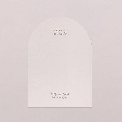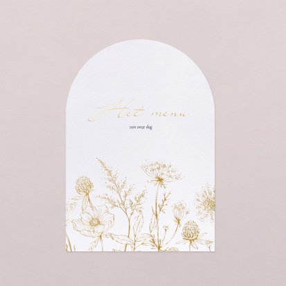 Foliedruk geeft een luxe uitstraling. Je kunt niet alleen kiezen voor safe-the-date kaarten en trouwkaarten met foliedruk, maar het is ook mogelijk om dit door te zetten in je menukaarten. De goudfolie ligt op het papier, waardoor je met je vingers een reliëf voelt. Niet alleen staat dit chique, het geeft jouw menukaarten ook een romantische uitstraling. Ideaal dus tijdens een dag waarop jullie de liefde vieren. Neem ook een kijkje bij de bijpassende programma's en tafelkaartjes.
