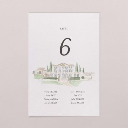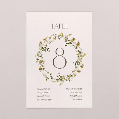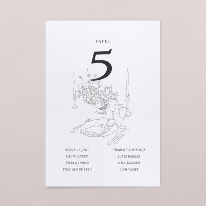 Hang de kaarten bij de ingang van de zaal en help jullie gasten bij het vinden van hun tafel. Eén kaart met een nummer en/of naam van de tafel per tafel en de lijst met personen die aan de tafel komen te zitten. Wees origineel en plaats de kaarten bij de ingang van de zaal in een vintage lijst, maak ze vast aan een grote ladder of aan wat lintjes zodat ze zweven...