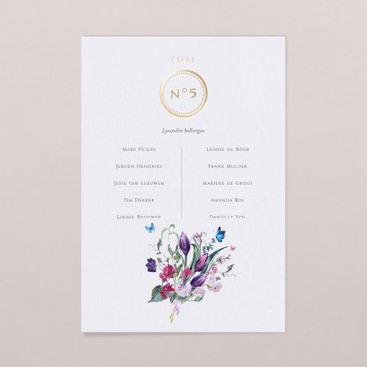 Hang de kaarten bij de ingang van de zaal en help jullie gasten bij het vinden van hun tafel. Eén kaart met een nummer en/of naam van de tafel per tafel en de lijst met personen die aan de tafel komen te zitten. Wees origineel en plaats de kaarten bij de ingang van de zaal in een vintage lijst, maak ze vast aan een grote ladder of aan wat lintjes zodat ze zweven...