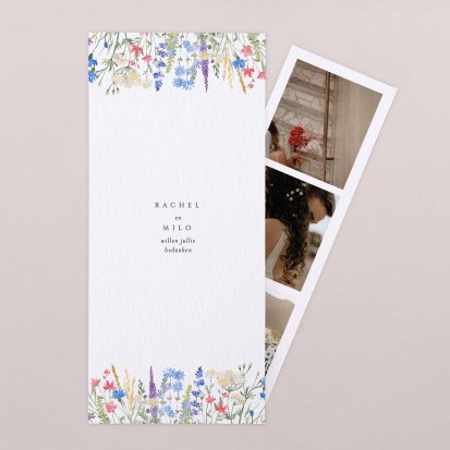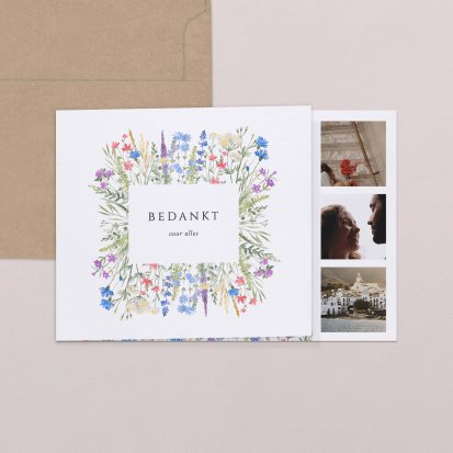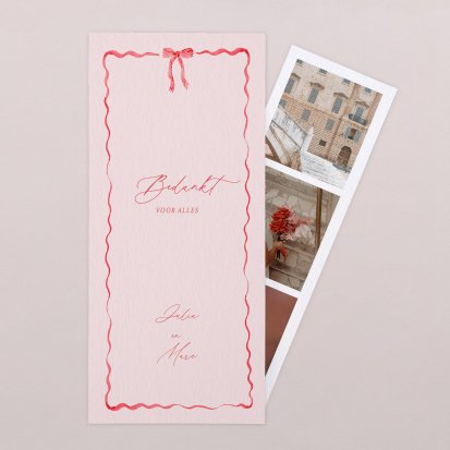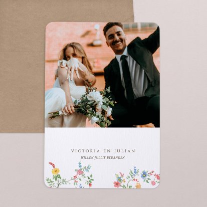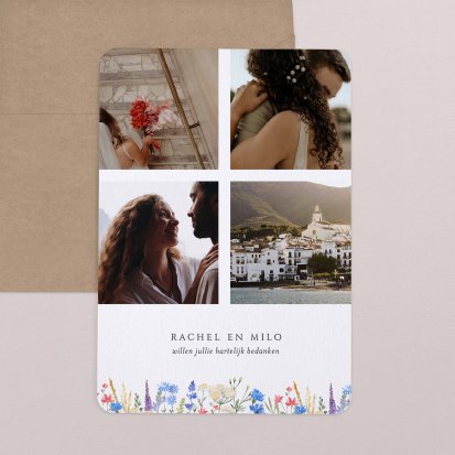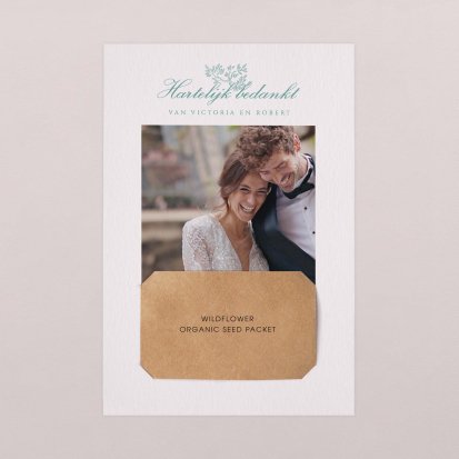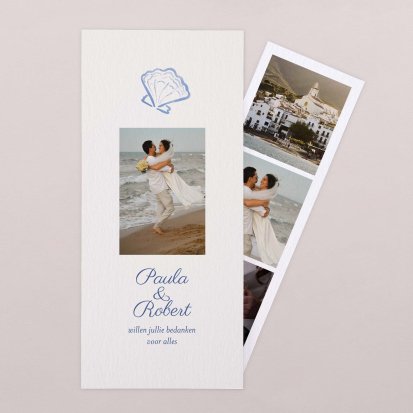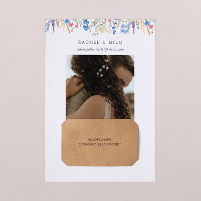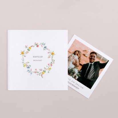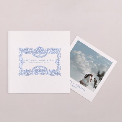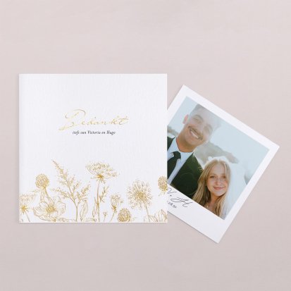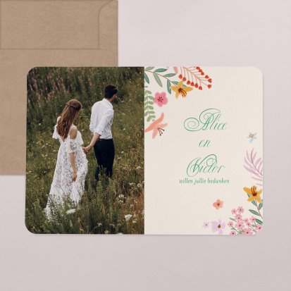 Met de schitterende bedankkaartjes van Cotton Bird verleng je de napret van jullie bruiloft. Neem een kijkje bij het uitgebreide assortiment om jullie perfecte bedankkaart te vinden en verstuur er een die helemaal past bij jullie stijl. Het hele jaar door worden de collecties door onze designers vernieuwd, zodat er iedere keer weer unieke bedankkaarten te vinden zijn. Ga bijvoorbeeld voor een bedankkaart met een grote foto van jou en je geliefde op de voorkant met romantisch afgeronde hoeken, of kies voor een bedankkaartje waar je een polaroid in kwijt kunt. Kies de mooiste foto van jullie samen uit en voeg een persoonlijke boodschap toe.