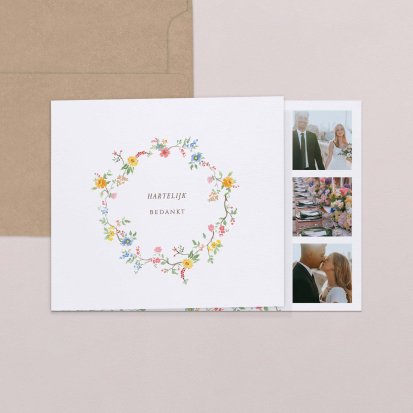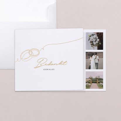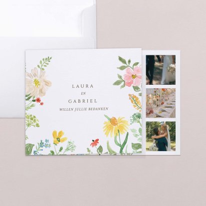 Jullie bruiloft was een dag om nooit te vergeten. Hebben jullie de grote dag gevierd met de beste vrienden en familie om jullie heen? Hebben jullie samen gelachen en genoten, zijn er nog grappige speeches gegeven en hebben jullie schitterende cadeaus in ontvangst genomen? Dan wil je jouw gasten natuurlijk graag bedanken voor hun aanwezigheid op jullie trouwen. Zonder de gasten was dit feest niet hetzelfde geweest. Daarbij hebben jullie prachtige foto’s van laten maken die je wilt delen. Er zijn genoeg redenen te bedenken om jouw gasten te verrassen met een mooie bedankkaart!