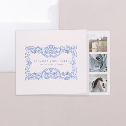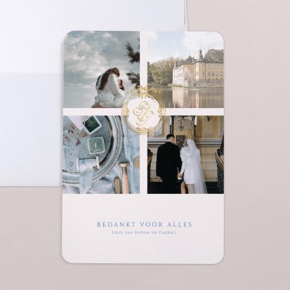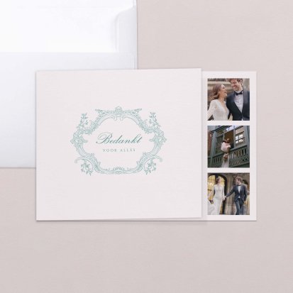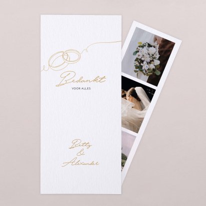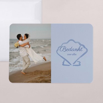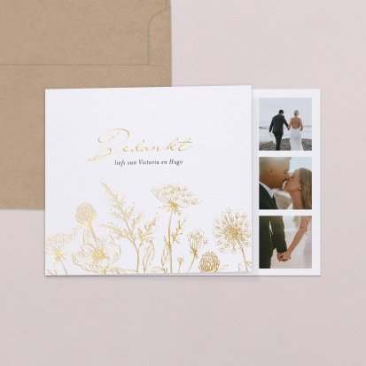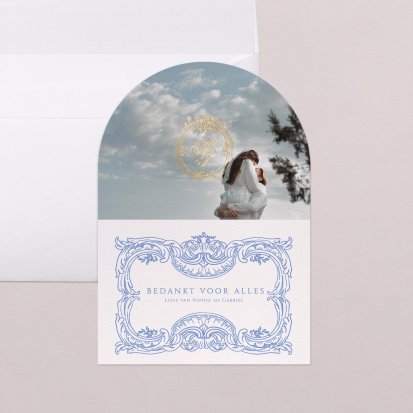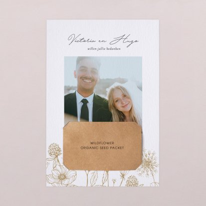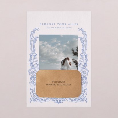 Twijfel je of je na de bruiloft al je gasten een bedankkaartje moet sturen? Niets moet, maar het gebaar wordt wel zeer op prijs gesteld door jouw lieve vrienden, familie en collega's die aanwezig waren op de bruiloft. Een paar weken na de bruiloft vinden jullie bruiloftsgasten een schitterende, chique envelop op de deurmat. Zodra ze deze openen zien ze jullie mooie foto's en lieve woorden en denken ze direct terug aan jullie grote dag. Bij Cotton Bird heb je de keuze uit de mooiste ontwerpen. Ga bijvoorbeeld voor een bedankkaart in dezelfde stijl als jullie save the date en trouwkaarten. Je kunt natuurlijk ook voor een heel ander ontwerp kiezen. Alle bedankkaartjes worden gedrukt op hoogwaardig papier en ontworpen met een oog voor detail.