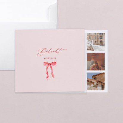 Je verstuurt de bedankkaarten doorgaans binnen een maand na jouw bruiloft. Als je eerst op huwelijksreis gaat, of een bedankkaart met foto wilt sturen, moet je nog even wachten. Meestal kan de fotograaf de foto's wel binnen een maand leveren, of in ieder geval een paar van de mooiste beelden naar je sturen die dan al bewerkt zijn. Zo kun je binnen een paar weken na de bruiloft een origineel bedankkaartje opsturen naar jouw lieve gasten. Ben je van plan om een bedankkaart te sturen? Bespreek dit dan altijd even met de fotograaf, zodat jullie op één lijn zitten qua planning.