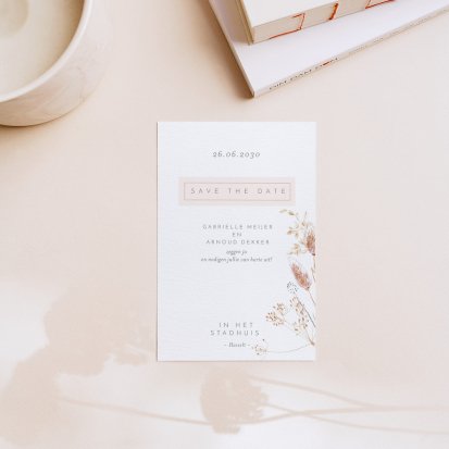 Jullie datum staat vast. Verras je naasten door de bruiloft direct aan te kondigen! Stuur deze kaartjes zo snel mogelijk en "reserveer" jullie gasten voordat ze hun vakanties gepland hebben voor de zomer!
