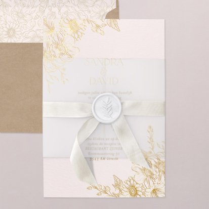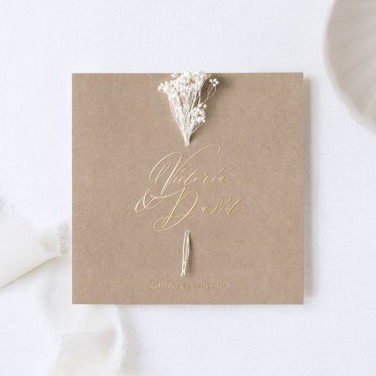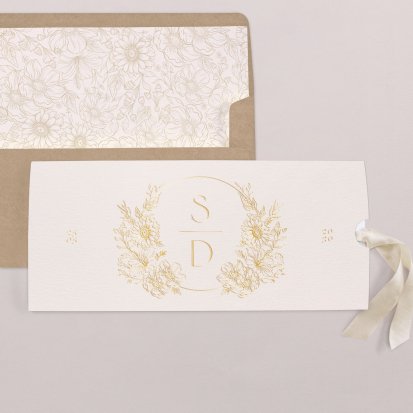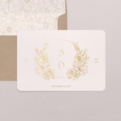 Foliedruk is een speciaal afwerkproces waarbij jouw trouwkaarten eerst worden gedrukt, vervolgens worden gelamineerd en ten slotte worden voorzien van goudfolie. Deze dekkende folie is zelfs voelbaar, omdat deze echt op de kaart ligt. Dit zorgt ervoor dat jouw uitnodiging meer karakter krijgt en er diepte in de kaart ontstaat. Foliedruk is zowel mogelijk aan alleen de voorkant van de uitnodiging, maar ook aan beide zijden van de trouwkaart. Personaliseer het ontwerp helemaal naar je eigen wens en neem ook een kijkje bij de bijpassende enveloppen en sluitstickers.