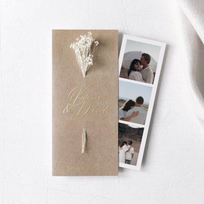 Sommige ontwerpen zijn voorzien van kalkpapier waarop de goudfolie wordt gedrukt. Het kalkpapier zorgt voor een zachte lichtspeling en geeft je trouwkaart een elegante en klassieke uitstraling. Laat jullie namen in het goud op het kalkpapier drukken en voorzie de uitnodiging van jullie mooiste foto. Zo verras je vrienden en familie op een unieke manier met jullie trouwplannen. Ook leuk: een trouwkaart met ingelegde fotostrip. Jij kunt meerdere van je favoriete foto's kwijt en de ontvanger kan de fotostrip op de koelkast hangen of gebruiken als boekenlegger.