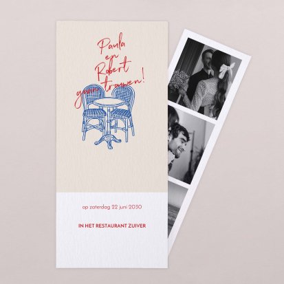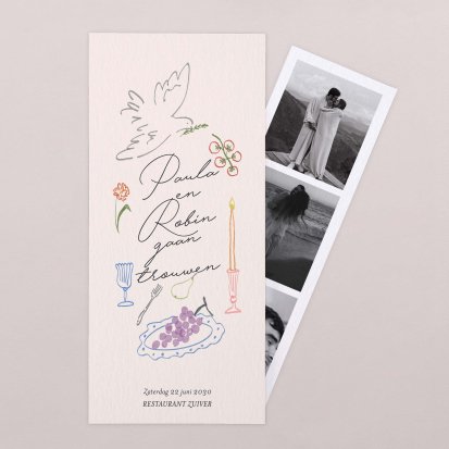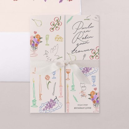 Klassieke trouwkaarten blijven razendpopulair. Deze trouwkaarten hebben een eenvoudig en stijlvol ontwerp en zijn vaak voorzien van een bijzonder detail, zoals een lintje, een boekenlegger of een klein labeltje. De klassieke trouwkaart is eenvoudig en toch sprekend, voor een echt wauw-effect bij het openen van de envelop. Ga bijvoorbeeld voor een grote kaart voorzien van lijntekeningen in de vorm van een Engelse tuin of voor een trouwkaart van wit tekenpapier, Canson stijl in de vorm van een hoesje. Deze trouwkaart bestaat uit verschillende onderdelen en je kunt deze zelf naar wens samenstellen. Heb jij hulp nodig bij het vinden van jouw ideale bruiloftsuitnodiging? Neem dan contact op met ons team, want wij helpen je graag verder.