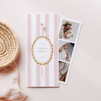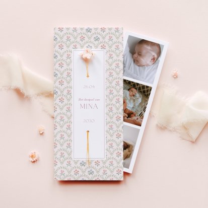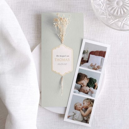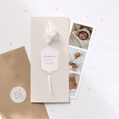 Bij Cotton Bird vind je unieke doopkaarten. Kies bijvoorbeeld voor een schattig zachtroze kaartje om de doop van je kleine meid aan te kondigen, of ga voor een stoer kaartje gedrukt op authentiek kraftpapier. Ga jij voor een staand formaat of een liggend ontwerp? En heeft een enkele kaart of een dubbele kaart jouw voorkeur? Welk ontwerp jij ook kiest, je geeft jouw eigen draai aan deze plechtige kaart. Sommige dubbele kaarten zijn voorzien van een loszittende fotostrip, zodat jij je favoriete foto's van je kind kunt delen met je gasten.
