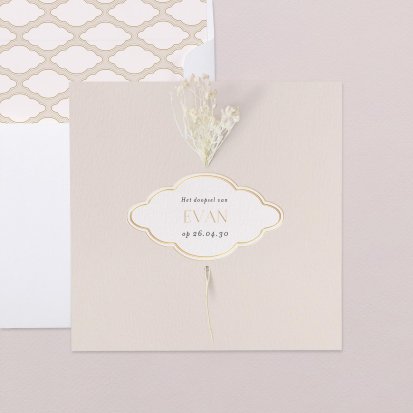 Goudfolie geeft een extra dimensie aan jouw doopkaart. Het folielaagje ligt mooi op de kaart gedrukt en zorgt voor diepgang. Er zijn zowel doopkaarten met foliedruk aan de voorkant als kaarten waarop de uitnodigingstekst in het goud wordt gedrukt. Ga jij voor een eenvoudig exemplaar of wil jij je mooiste foto op de kaart laten drukken? Het behoort allemaal tot de mogelijkheden. Op de kaart vermeld je in ieder geval de datum, de naam van je kindje en de naam van de kerk waar je kind wordt gedoopt. Het valt aan te raden om je telefoonnummer ook te vermelden, zodat genodigden kunnen laten weten of ze komen. Wil jij een persoonlijke tekst of een mooi gedicht toevoegen? Op veel modellen is hier voldoende ruimte voor.