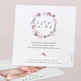 Bij het openvouwen van deze vierkante dubbele geboortekaart, ontdekken familie en vrienden een mooie foto van jullie kindje, samen met een persoonlijk berichtje.