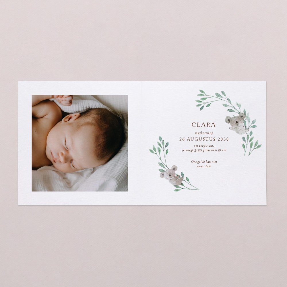 Welkom kleintje! Op deze geboortekaart Koala Family verwelkomen 4 schattige koala?s je dochter of zoon. Verspreid het heugelijke nieuws aan familie en vrienden dat je meisje of jongen is geboren met dit vrolijk design.