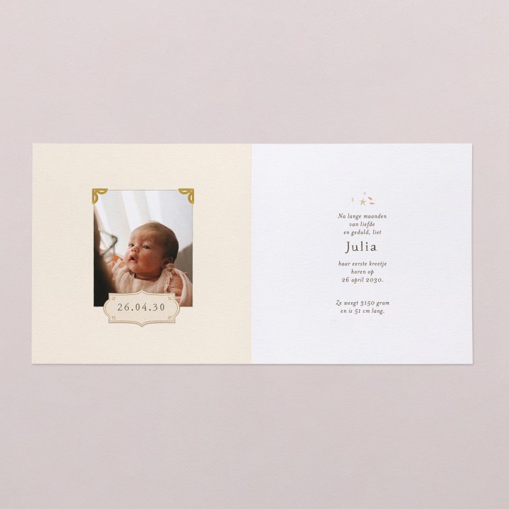 Leg jullie vreugde vast met het Oper geboortekaartje. Met de schattige sterrenillustraties kondigt dit ontwerp op elegante wijze de komst van jullie nieuwe baby aan.