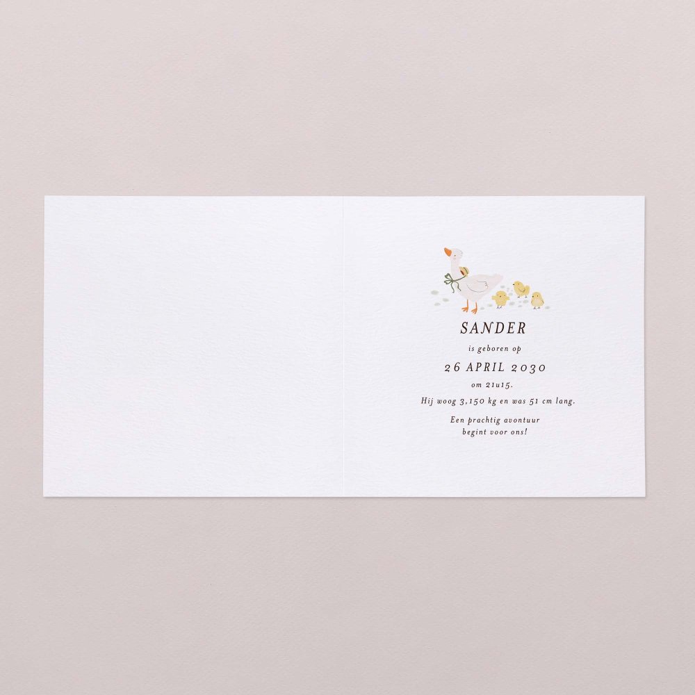 Een krans van narcissen, een schattige bij, een gans en kuikens sieren het geboortekaartje Yellow spring. Een prachtig tafereel in zonnige geeltinten, ideaal om de geboorte van je baby in de lente of zomer aan te kondigen.