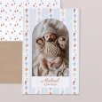 Beertjes, vosjes en luchtballonnen sieren de geboortekaart Slaapliedje. Deze schattige figuurtjes, liefdevol geïllustreerd als een fries, kondigen de geboorte van jullie dochtertje of zoontje aan. Cursief lettertype, een foto van de baby en een geruit motief maken dit plaatje compleet, perfect voor ouders die op zoek zijn naar een lief geboortekaartje.