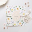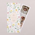 Narcissen, viooltjes, paardebloemen en andere kleurrijke bloemen sieren het geboortekaartje Lilly Rose. Fris en lenteachtig, compleet met schattige bijtjes, is dit ontwerp perfect om de komst van je dochter of zoon aan te kondigen.