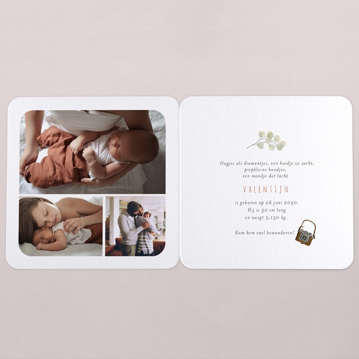 Dubbelzijdige, gevouwen kaart met ronde hoeken. Aan de binnenkant is er ruimte voor de aankondiging en een lief versje. De kaart wordt verkocht met twee etiketjes.