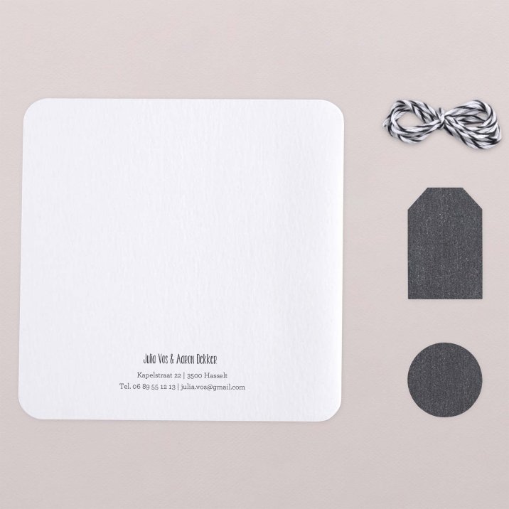 Dubbelzijdige, gevouwen kaart met ronde hoeken. Aan de binnenkant is er ruimte voor de aankondiging en een lief versje. De kaart wordt verkocht met twee etiketjes.