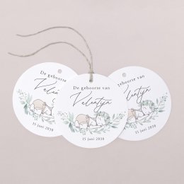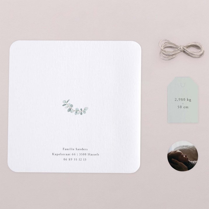 Dubbelzijdige, gevouwen kaart met ronde hoeken. Aan de binnenkant is er ruimte voor de aankondiging en een lief versje. De kaart wordt verkocht met twee etiketjes.