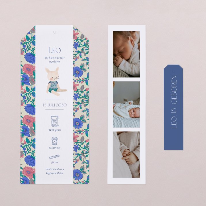 Geboortekaart, samengesteld uit drie kleine kaartjes die samen worden gebonden met een lintje naar keuze (optioneel).