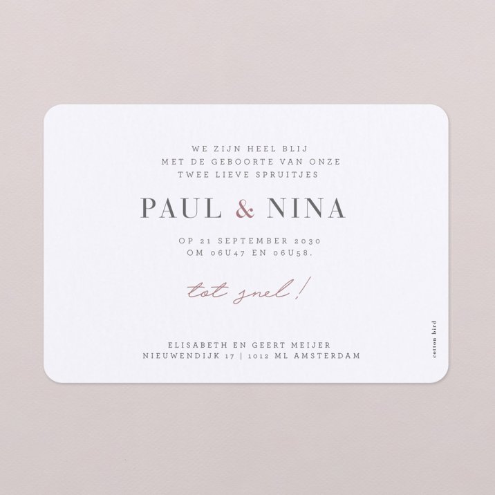 Eenvoud straalt met deze geboortekaart in liggend formaat en zachte afgeronde hoeken.