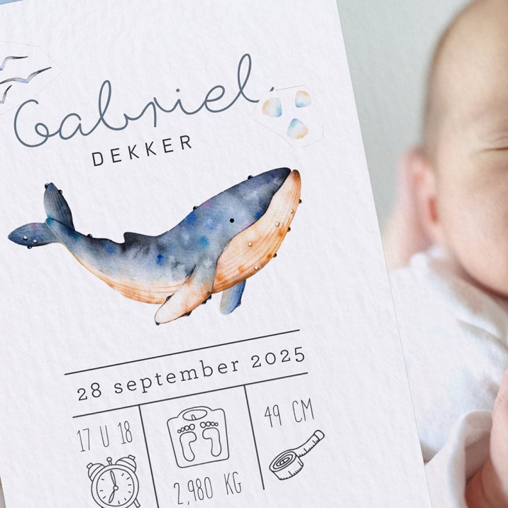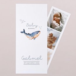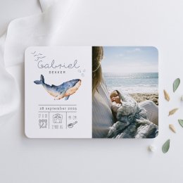 Een oceaan van liefde met deze prachtige walvis, strakke tekstopmaak en foto van de baby. Kondig de komst van jullie wonder aan met dit krachtig maar zacht model Blue Whale.