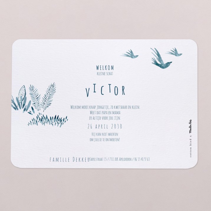 Eenvoud straalt met deze geboortekaart in liggend formaat en zachte afgeronde hoeken.