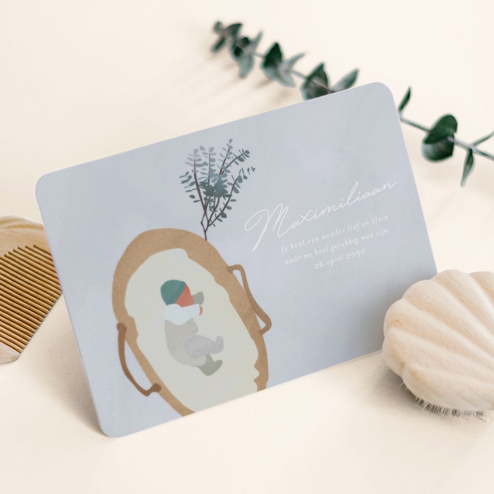 Een kleine jongen die in zijn knusse cocon ligt. Word verliefd op de pastelkleuren van de Cocoon - Blue geboortekaart en deel het gelukkige nieuws met je vrienden en familie op de mooiste manier.