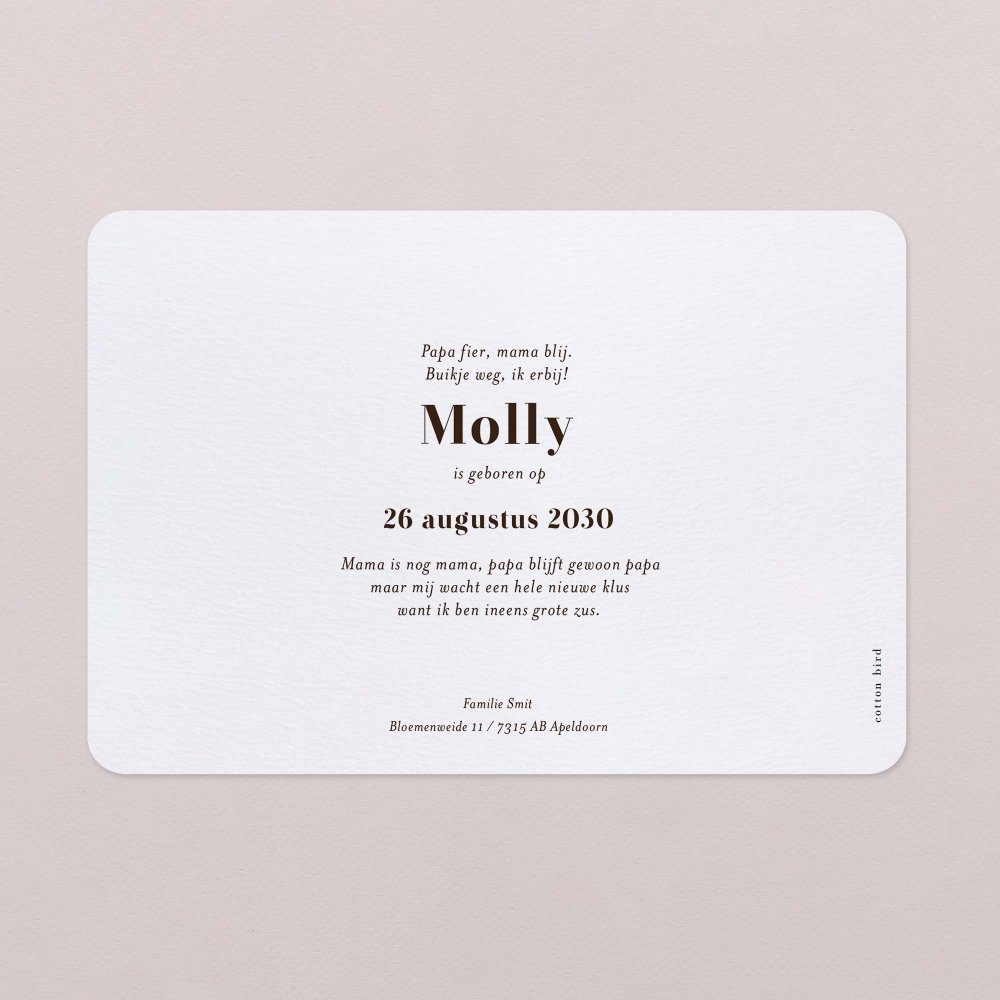 Eenvoud straalt met deze geboortekaart in liggend formaat en zachte afgeronde hoeken.