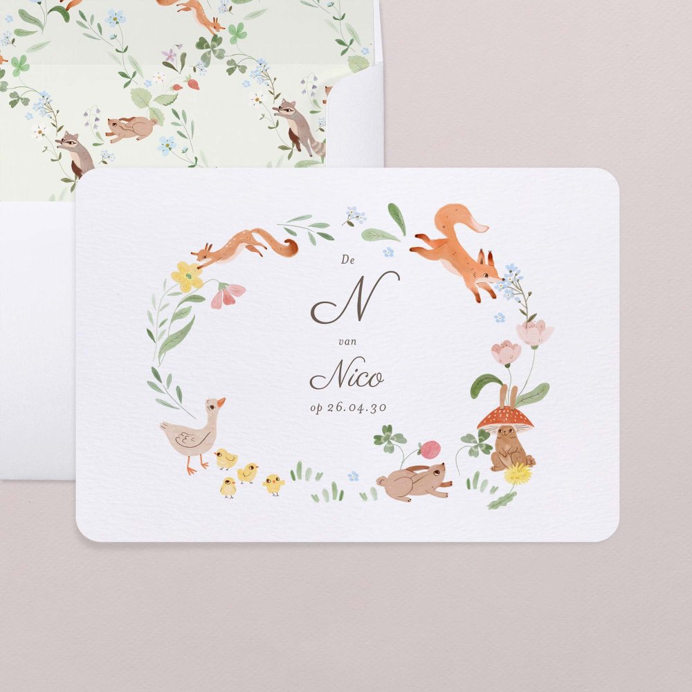 Vos, eekhoorn, gans, wasbeer, kuikens en zelfs konijntjes zijn de tedere boodschappers van jullie geluk op het geboortekaartje Wildy. Een kleurrijke creatie die de geboorte van je baby op een zachte manier aankondigt.