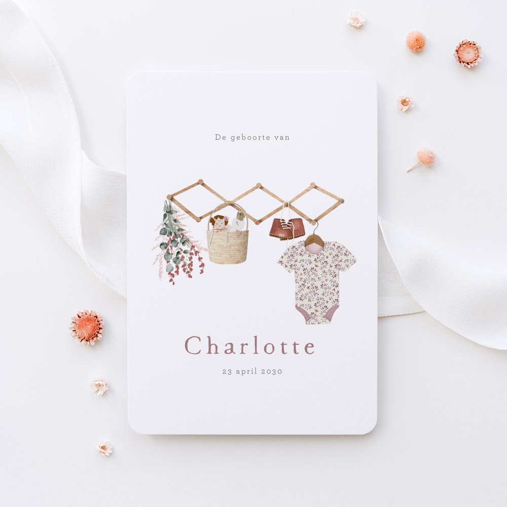 Eenvoud straalt met deze geboortekaart in staand formaat en zachte afgeronde hoeken.