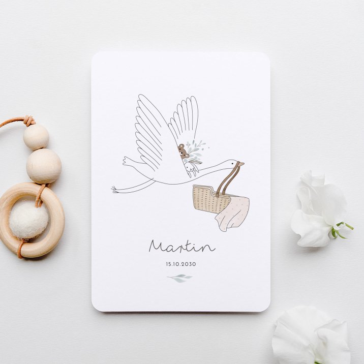 Een gans in plaats van een ooievaar! Met baby en de lieve kleine vriendjes van de pasgeborene op zijn rug. Deze prachtige illustratie op ons model Arrival lijkt zo uit een sprookje te stappen.