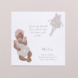 Kies het geboortekaartje Friendly Cat om de geboorte van je dochtertje aan te kondigen. Vrienden en familie zullen net als jij dol zijn op dit mooie, met liefde ontworpen, baby- en poezenknuffeltje duo.