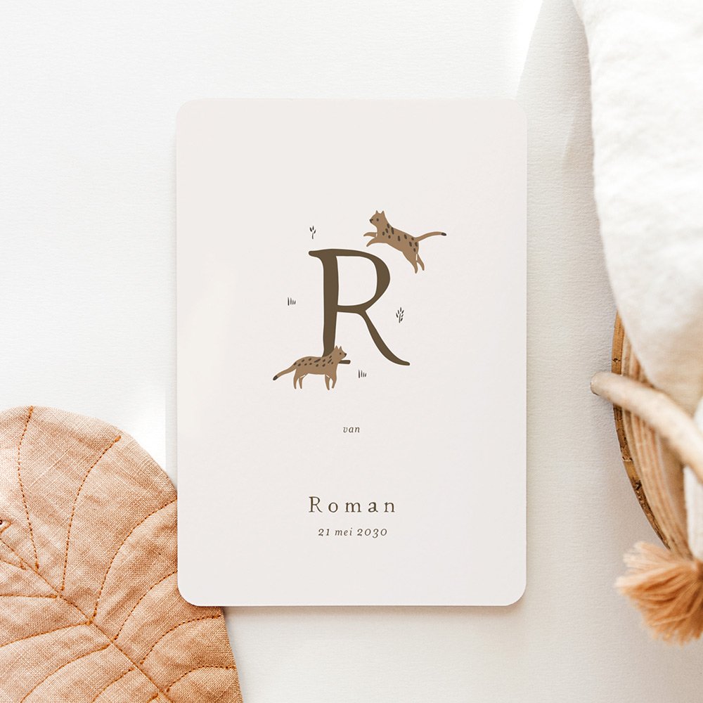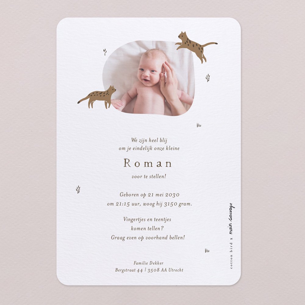 Snoezende poezen springen vrolijk om de eerste letter van baby's naam heen, kijken nieuwsgierig de eerste foto van ukkepukje aan, en kondigen iedereen op een liefelijke wijze het heugelijke nieuws aan. Smelt weg van deze geboortekaart Wild Cats.