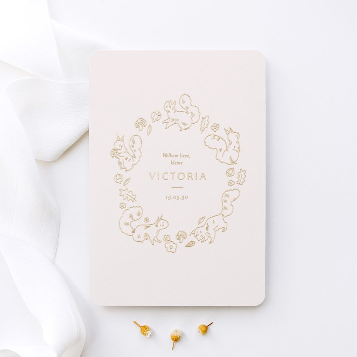 In de gouden ochtendgloren is er nieuw leven geboren?kleine knaagdiertjes komen nieuwsgierig piepen: is het een meisje of een jongen? Als een sprookjesverhaal vertelt deze geboortekaart Goud eekhoorntje de komst van je dochter of zoon. Zowel origineel als elegant met de krans en baby?s naam in glanzende goudfolie!