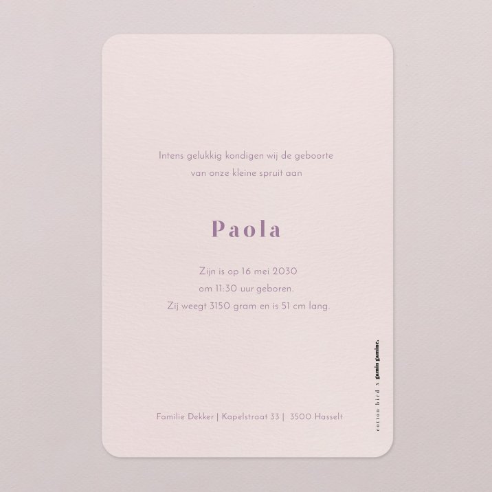 Eenvoud straalt met deze geboortekaart in staand formaat en zachte afgeronde hoeken.