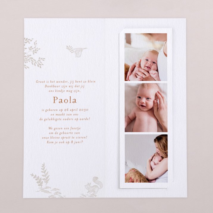 Bij het openvouwen van deze originele dubbele geboortekaart, ontdekt iedereen baby's eerste foto's op een aparte fotostrip, samengaand met de geboortegegevens en een persoonlijk berichtje.