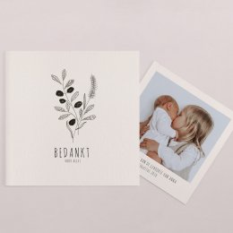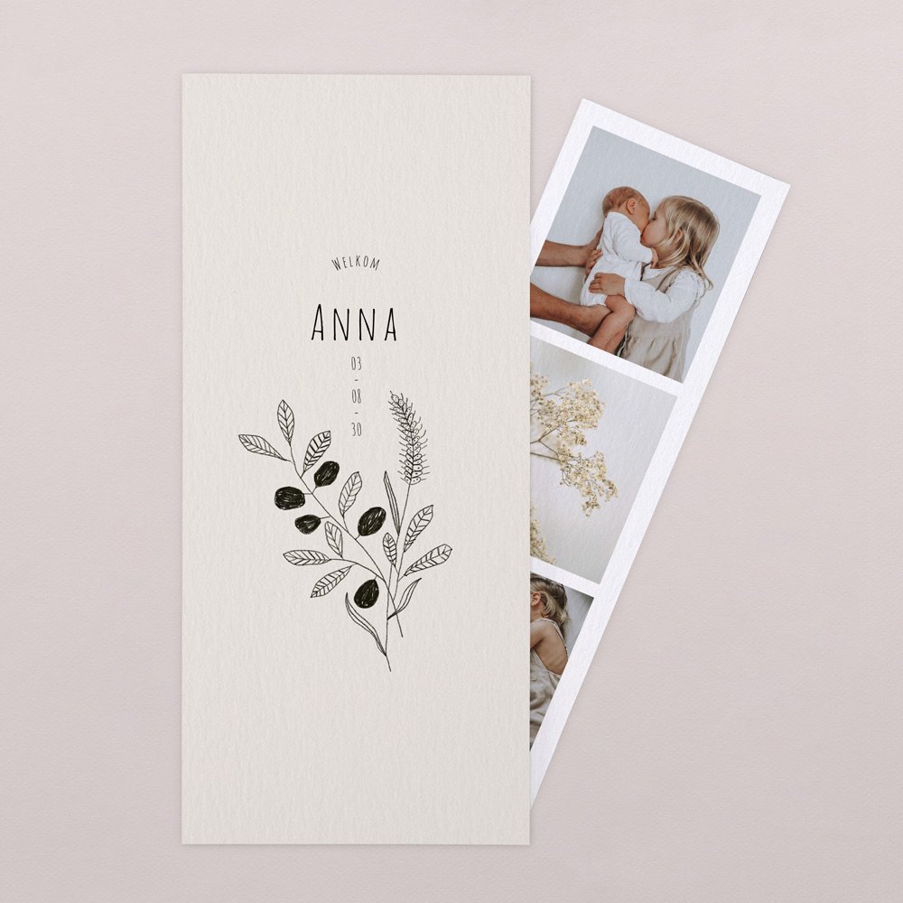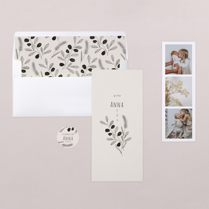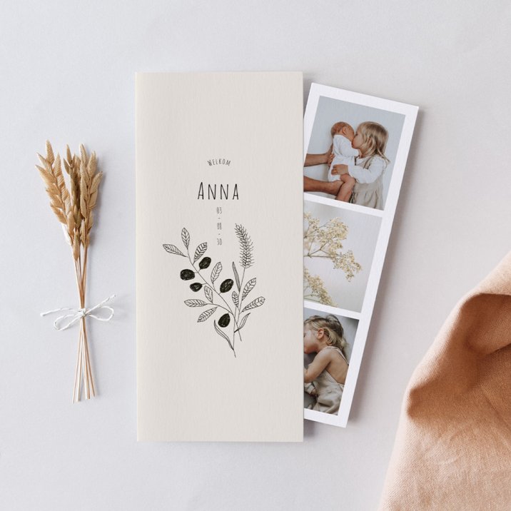 Fijn geschetste olijftakken en korenaren ontmoeten elkaar op de Sweet Lilly geboortekaart. Het natuurlijke en eenvoudige ontwerp is gewoonweg prachtig en weerspiegelt de puurheid van het kleine wezentje dat net geboren is.