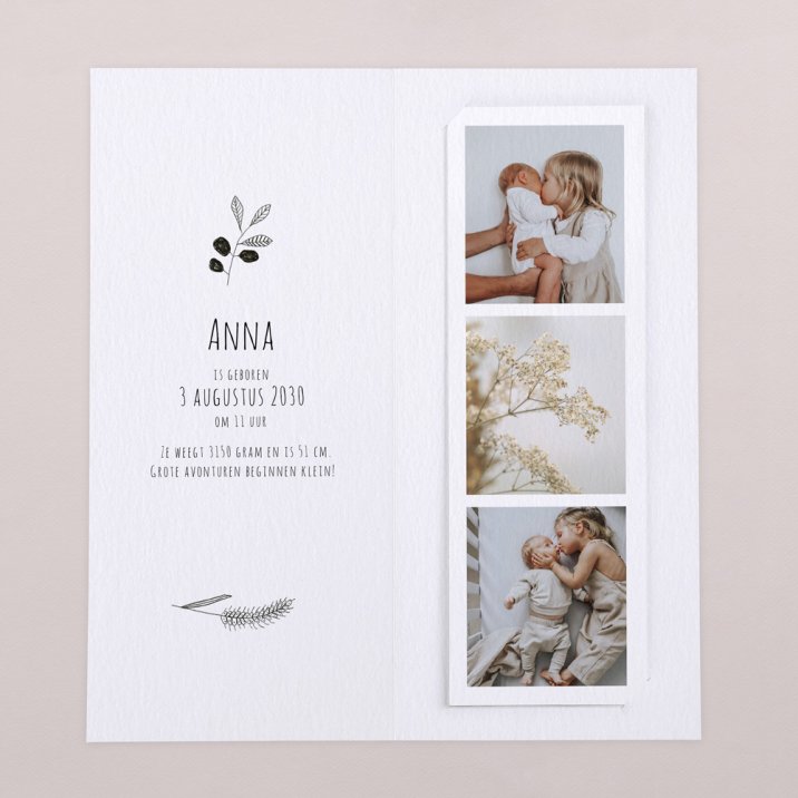 Bij het openvouwen van deze originele dubbele geboortekaart, ontdekt iedereen baby's eerste foto's op een aparte fotostrip, samengaand met de geboortegegevens en een persoonlijk berichtje.