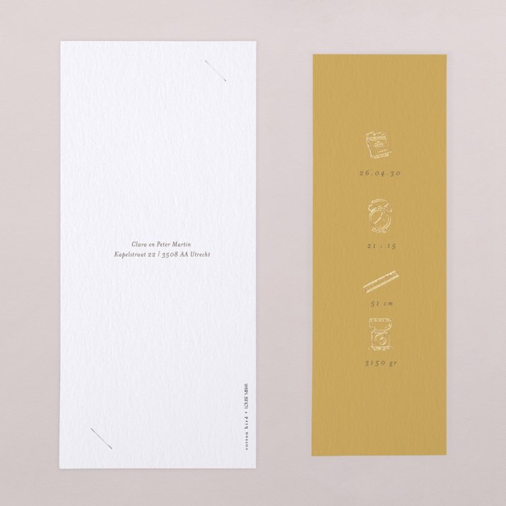 Bij het openvouwen van deze originele dubbele geboortekaart, ontdekt iedereen baby's eerste foto's op een aparte fotostrip, samengaand met de geboortegegevens en een persoonlijk berichtje.