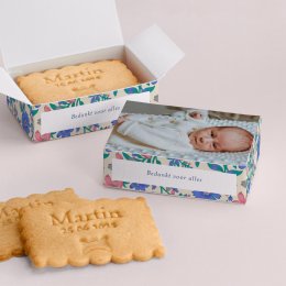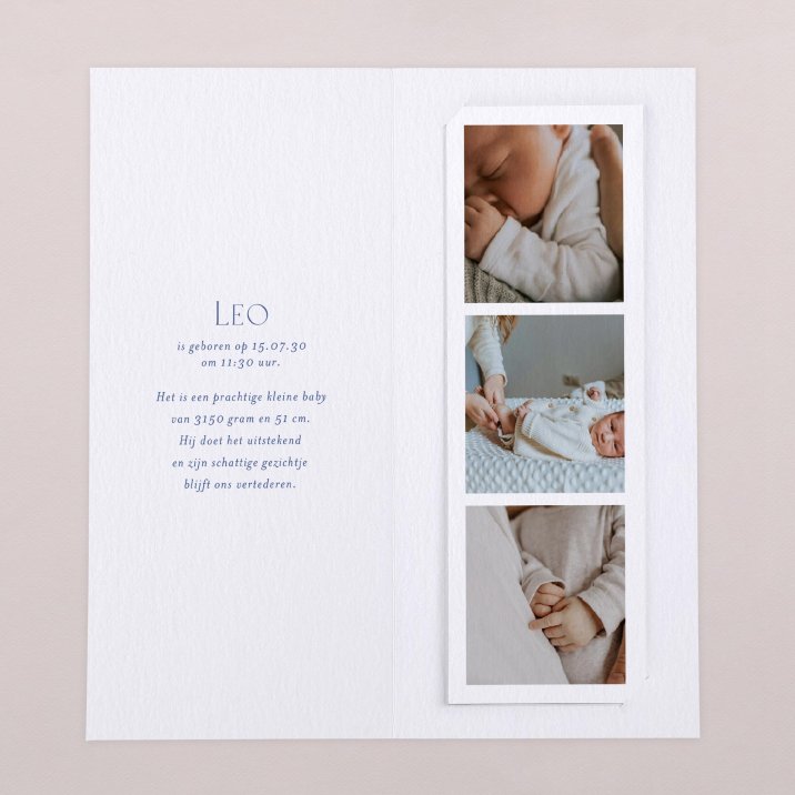 Bij het openvouwen van deze originele dubbele geboortekaart, ontdekt iedereen baby's eerste foto's op een aparte fotostrip, samengaand met de geboortegegevens en een persoonlijk berichtje.