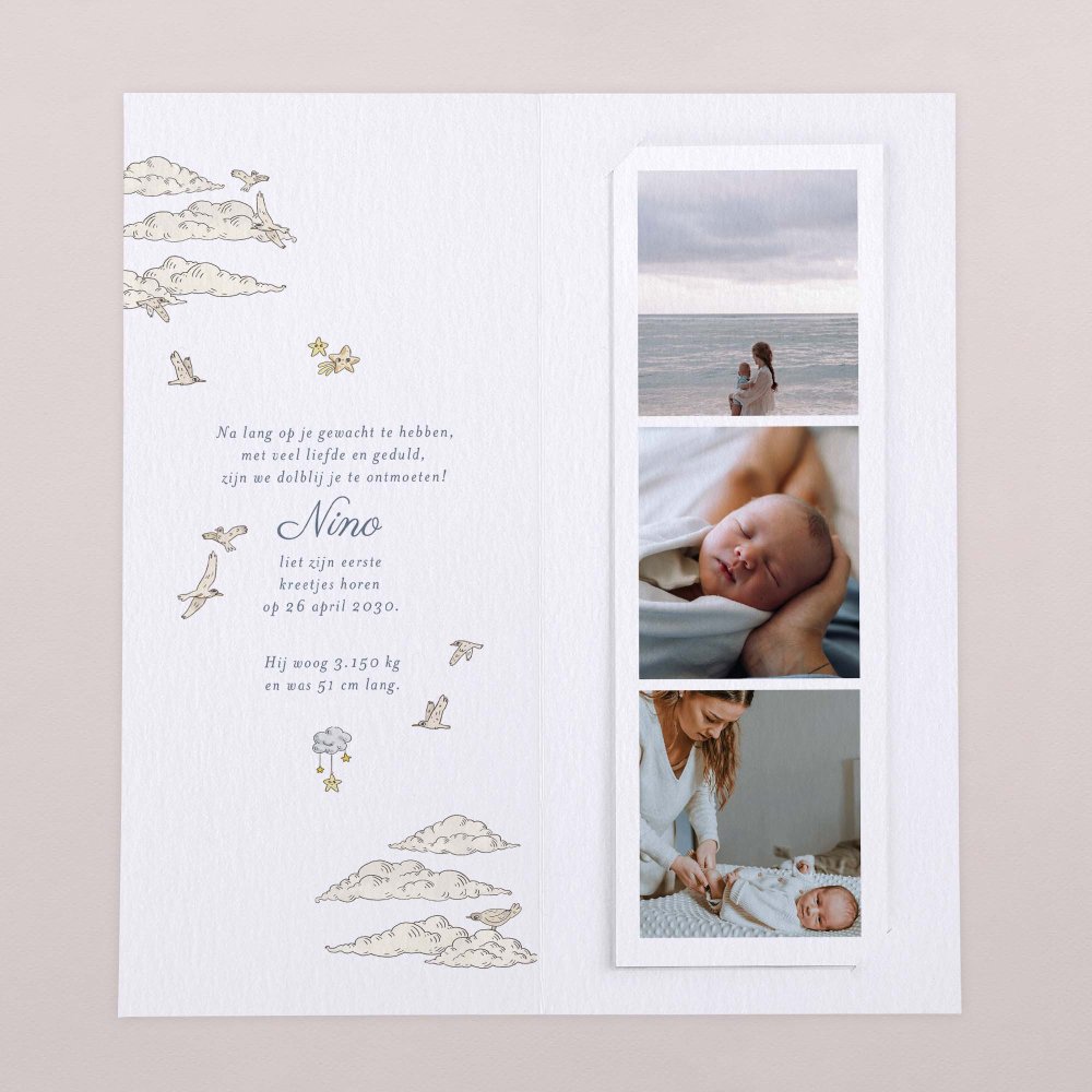 Bij het openvouwen van deze originele dubbele geboortekaart, ontdekt iedereen baby's eerste foto's op een aparte fotostrip, samengaand met de geboortegegevens en een persoonlijk berichtje.