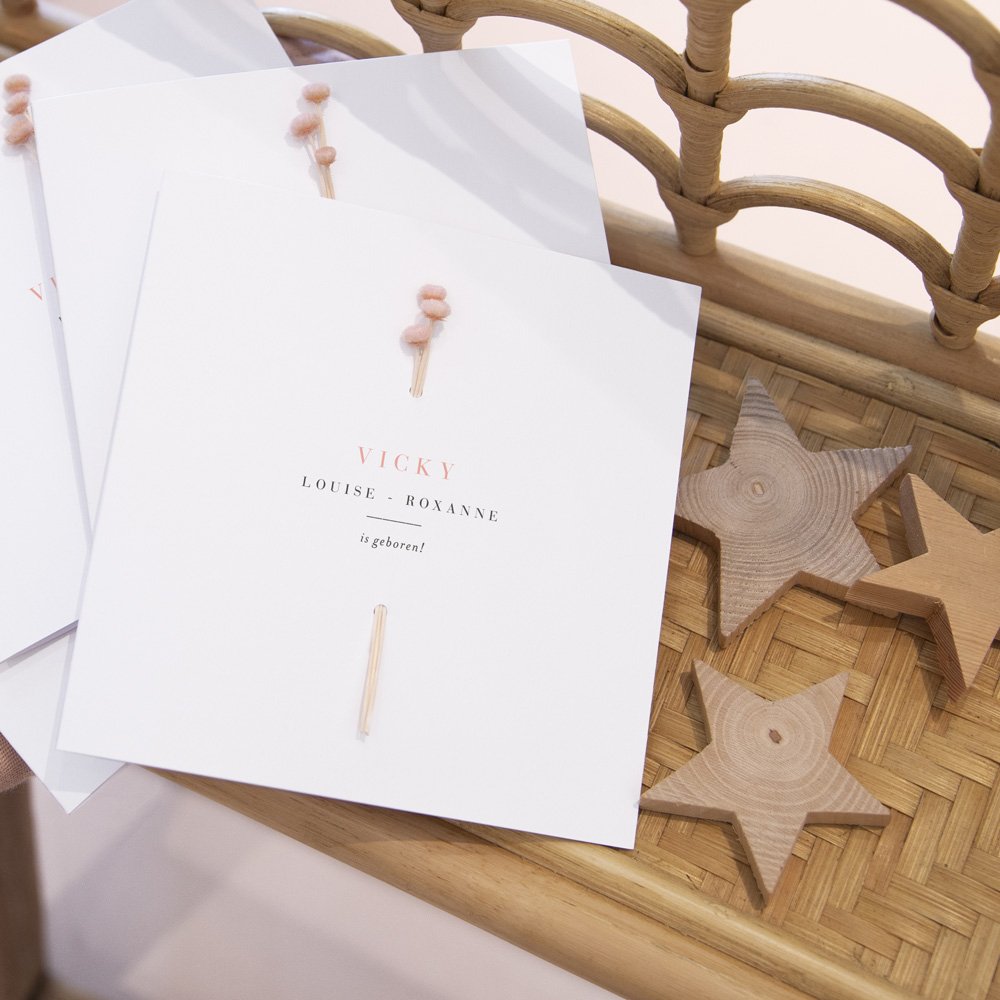 De roze kleur van de gedroogde Amarelino bloem geeft je geboortekaartje een unieke, vintage look.