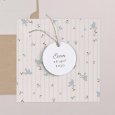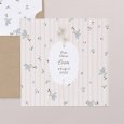 Een lieflijke rij blauwe vergeet-mij-nietjes siert het gestreepte geboortekaartje Myosotis. Een poëtisch ontwerp vol zachtheid, ideaal om de geboorte van je baby in de lente of zomer aan te kondigen.