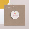 Dit geboortekaartje is een vouwkaart met een apart geperforeerd labetje.Aan de voorzijde van de kaart zijn er twee perforaties voorzien waar het lintje doorheen kan, om zo het labeltje aan de kaart te bevestigen (lintjes apart te bestellen).